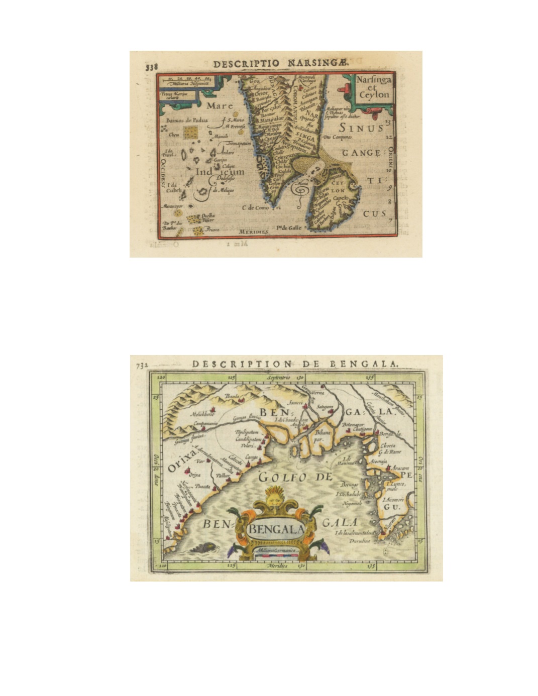 77) Narsinga et Ceylon By: Petrus Bertius Date: 1618 (Published) Amsterdam Dimensions: 3.35 x 4.9 inches (8.5 cm x 12.5 cm) A Highly decorative map from the Latin edition of Tabularum Geographicarum . It depicts India from Goa southward as well as Ceylon (Sri Lanka) and the Maldives. Many coastal towns are marked, such as Mangalor, Cananor, Cranganor, Cochin, Negapatam, Maliapor ubi S. Thomas sepultus esse dicitur (Mylapore where St. Thomas is said to be buried, i.e. present-day Chennai). Some sandbanks are indicated as well as interior mountain ranges, schematically. Condition: Excellent condition with a strong impression. $250 78) Bengala By: Petrus Bertius , Date: 1618 (published) Amsterdam Dimensions: 3.75 x 5.1 inches (9.5 x 13 cm) This miniature map of the Bay of Bengal appeared in a French edition of the miniature atlas Tabularum Geographicam. Towns are mostly on the coast but some are inland. The sea is stylized in sets of zigzag lines. On the reverse, page 731, is a section of text in French headed “Description de Narsinge,” describing, among other things, kingdoms in southern India, their armies with horses and elephants, products such as pearls and diamonds, the custom of widow burning, and the Portuguese in Goa. Title is in a baroque cartouche at bottom center, with a gargoyle at the top and a sea monster to its left. Condition: Excellent condition with lovely hand coloring. $250